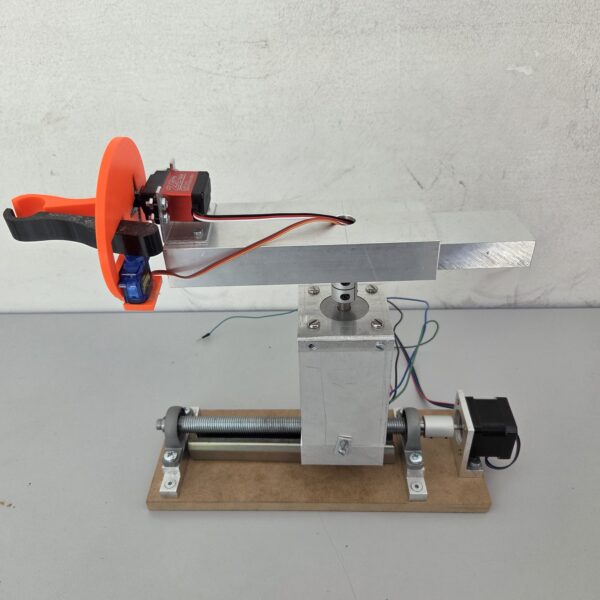 Der Roboterarm ist als einfacher, kranähnlicher Aufbau aus Aluminiumprofilen gefertigt. Er verfügt über eine motorisierte Drehachse für die horizontale Ausrichtung und einen pneumatischen Greifer, der über den Kompressor betrieben wird. Der Greifer übernimmt die vertikale Bewegung (hoch/runter) sowie das Öffnen/Schließen und kann das Gefäß zum Ausschütten gezielt drehen. Die reduzierte Kinematik (Drehen + pneumatische Hub- und Greiffunktion) sorgt für robuste, wartungsarme Abläufe und erfüllt die Anforderungen zum sicheren Dosieren und Entleeren der chemischen Lösung. Die Ansteuerung erfolgt über die SPS im Zusammenspiel mit der Pneumatik.
