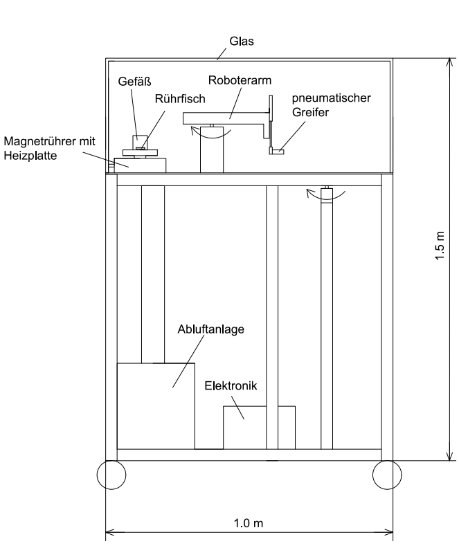 SynthoBot ist eine mobile, gasdicht verriegelte Prozessanlage: Ein einfacher Roboterarm dosiert Reaktanden und übergibt sie an Heizplatte und Magnetrührer, die Filteranlage hält gefährliche Dämpfe zuverlässig zurück – kompakt, sicher und für den Unterricht gedacht.